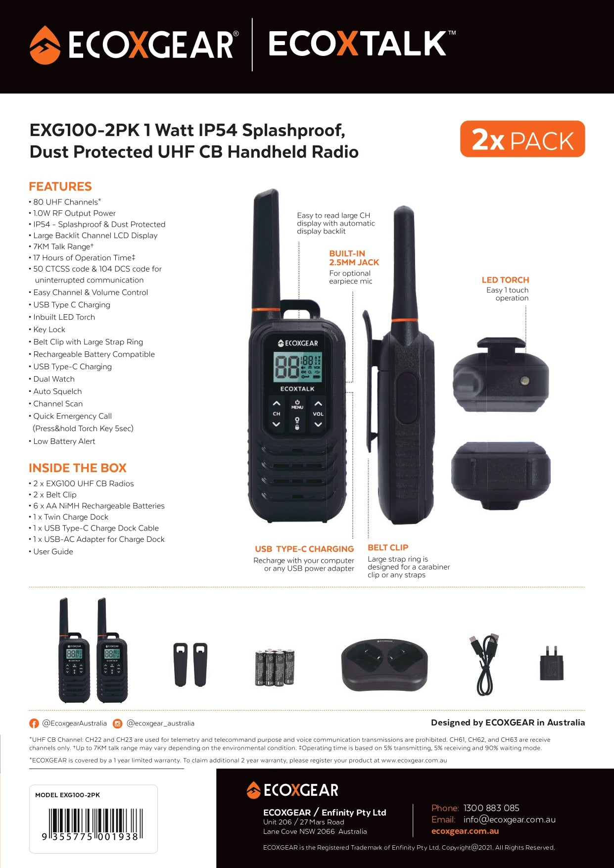 EXG100 UHF CB Handheld radios designed to resist the effects of rain or water splashes which you are likely to encounter on your treks, and adventures. A-built-in LED Torch provides an emergency light when needed. With a range of up to 7Km, the EXG100 will keep you connected.