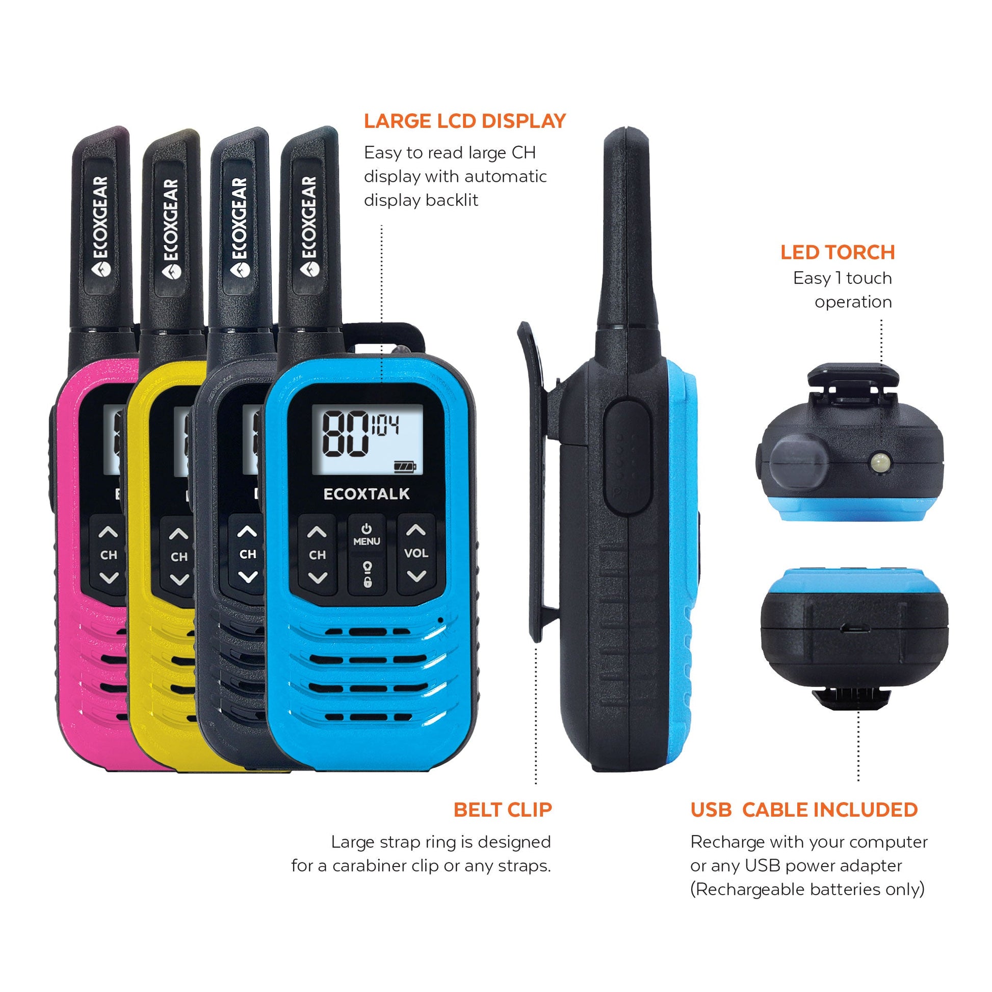 EXG50-4PK (Four Colours - Black, Blue, Pink, and Yellow). Simple and easy to use by the entire family, the ECOXGEAR ECOXTALK EXG50 UHF CB Handheld Radios are perfect for staying in touch when you are outdoors: whether you're camping, hiking or at the park. EXG50 Radios have a range of up to 3KM and feature 80 channels (50 CTCSS codes & 104 DCS codes for uninterrupted communication). Allowing you to stay in contact with your family and friends.