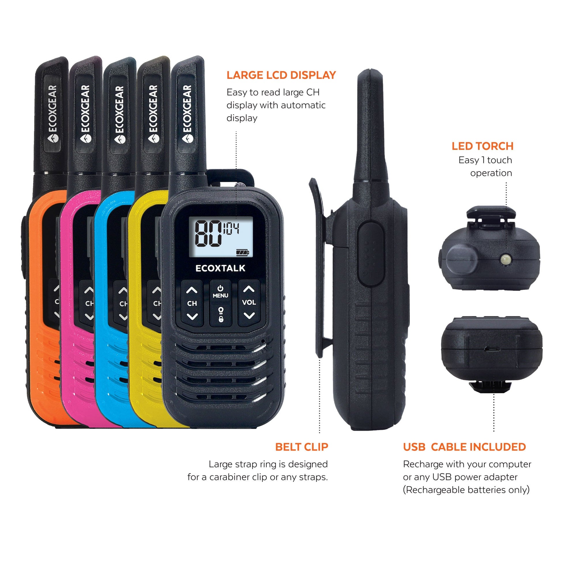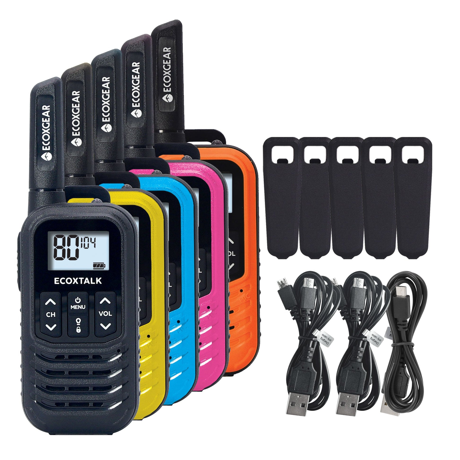 EXG50-5PK (Five Colours - Black, Blue, Pink, Orange, and Yellow). Simple and easy to use by the entire family, the ECOXGEAR ECOXTALK EXG50 UHF CB Handheld Radios are perfect for staying in touch when you are outdoors: whether you're camping, hiking or at the park. EXG50 Radios have a range of up to 3KM and feature 80 channels (50 CTCSS codes & 104 DCS codes for uninterrupted communication).