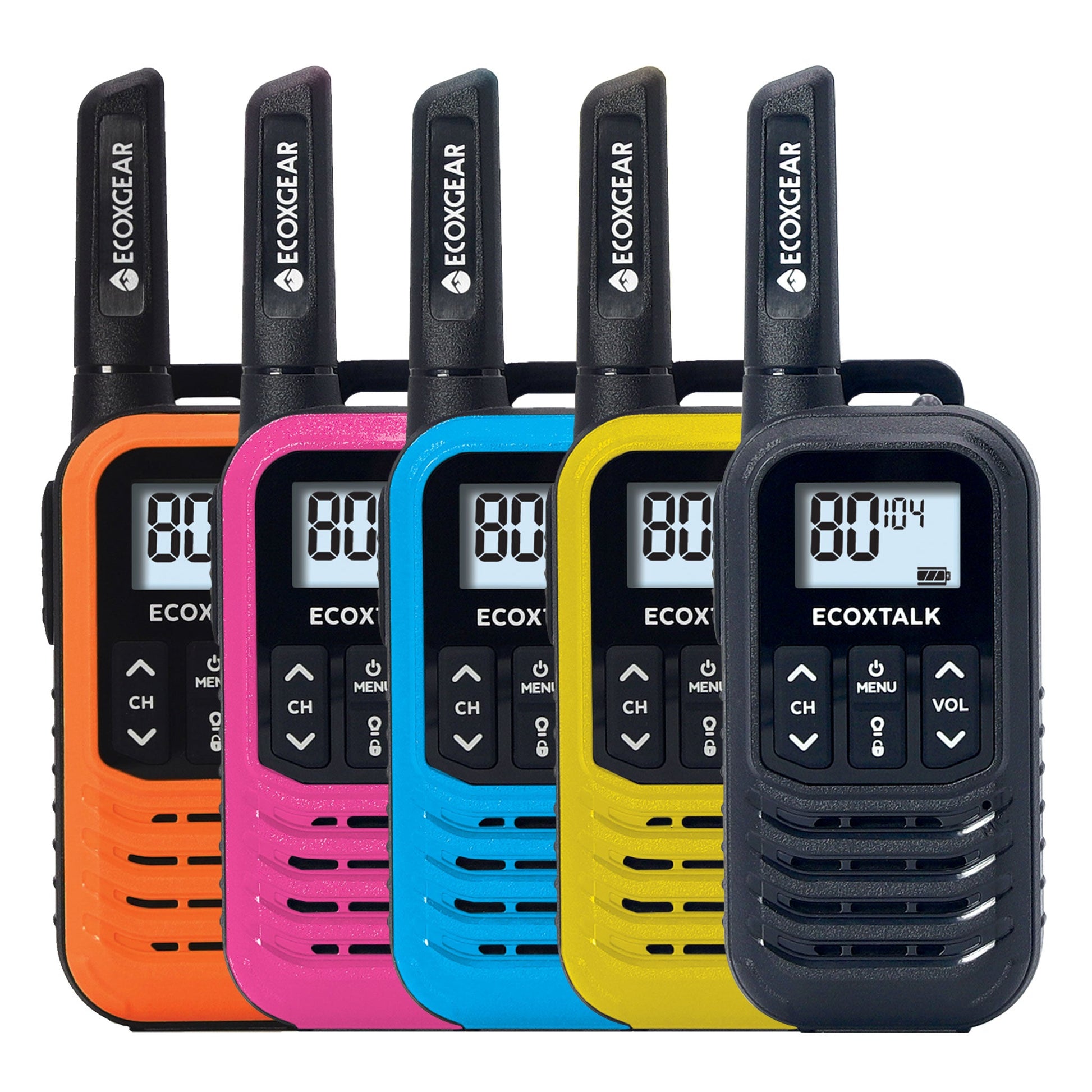 EXG50-5PK (Five Colours - Black, Blue, Pink, Orange, and Yellow). Simple and easy to use by the entire family, the ECOXGEAR ECOXTALK EXG50 UHF CB Handheld Radios are perfect for staying in touch when you are outdoors: whether you're camping, hiking or at the park. EXG50 Radios have a range of up to 3KM and feature 80 channels (50 CTCSS codes & 104 DCS codes for uninterrupted communication).