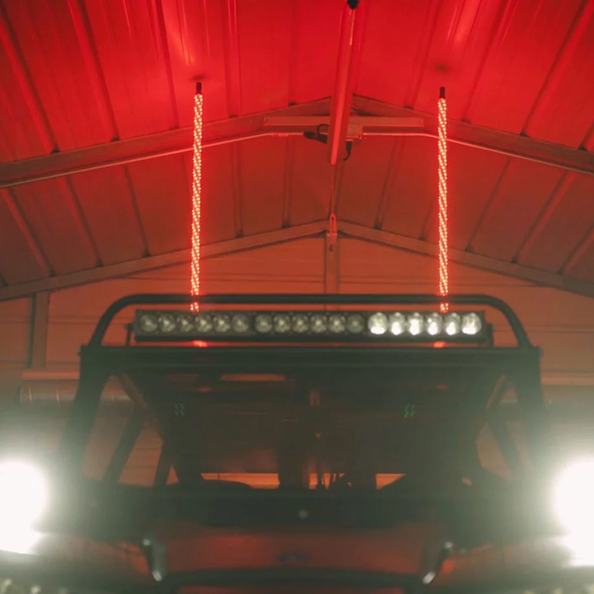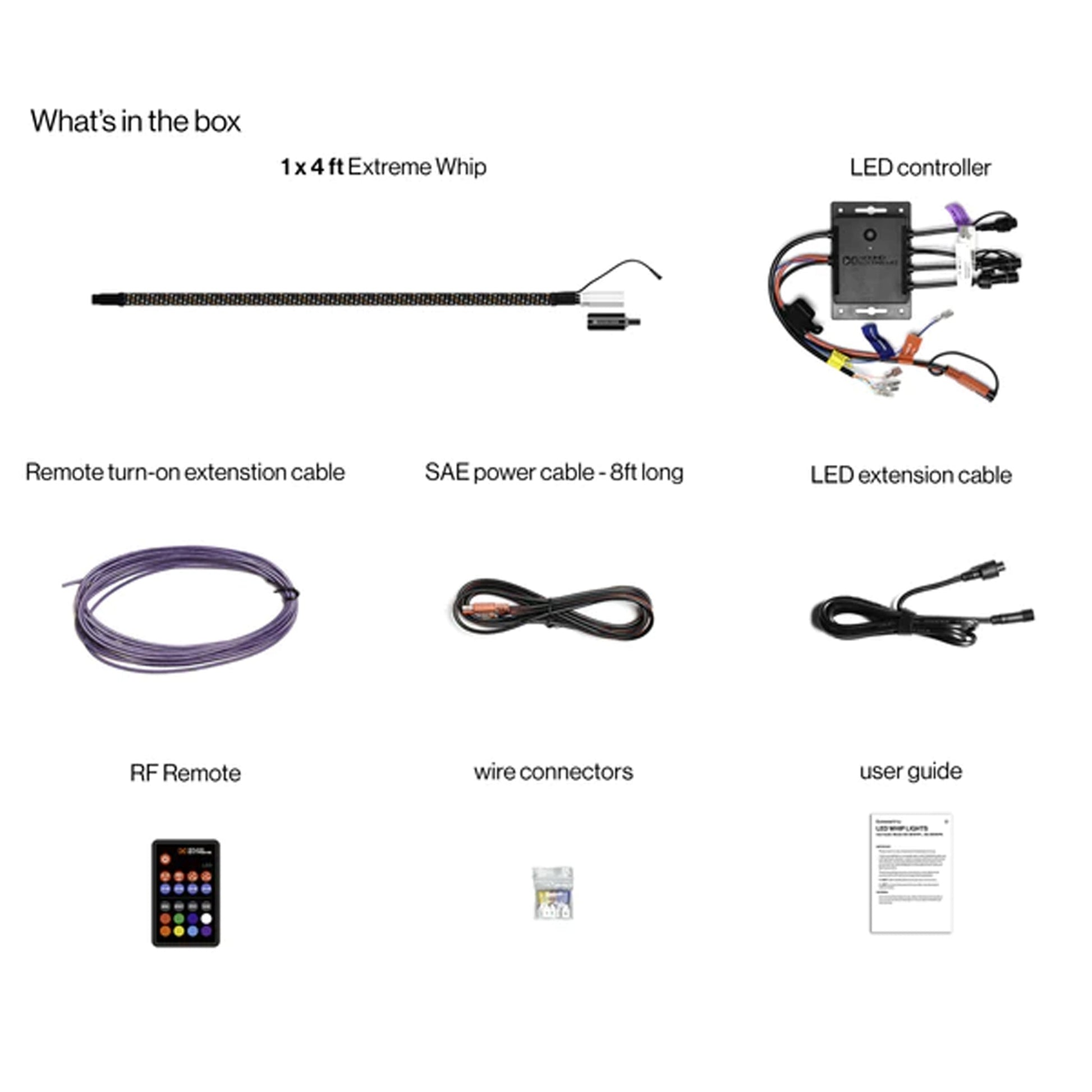 4 Zone LEDCast Controller Included. SoundExtreme whip kit with 1 x 4ft (122cm) RGBIC Multi-Color LED Whip with Quick Release Magnetic Whip Mount by ECOXGEAR is a 12V LED powersports vehicle accent light to create breathtaking lighting effects on your vehicle. All the lights can also be controlled by the smartphone SoundExtreme App and RF remote control.