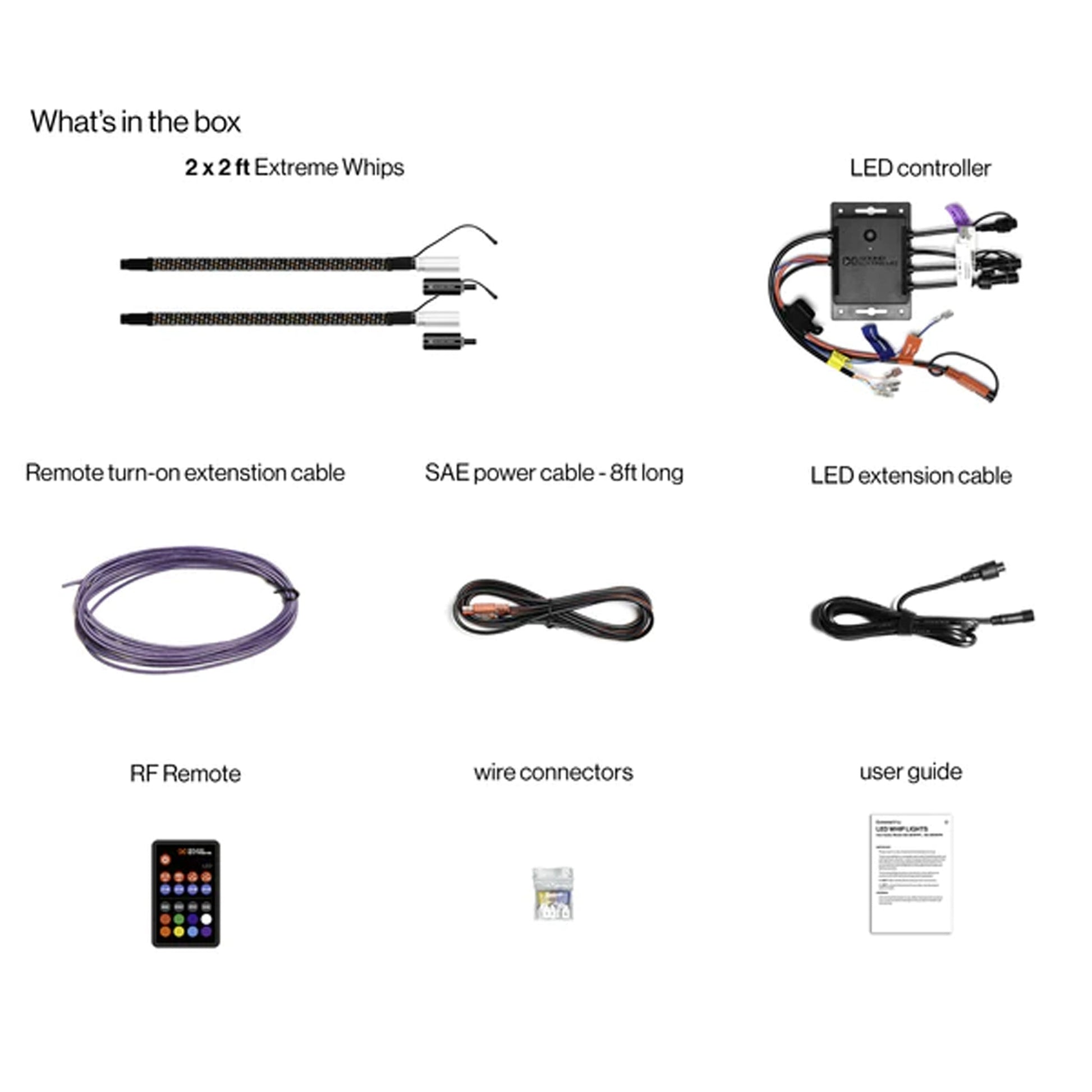 4 Zone LEDCast Controller Included. SoundExtreme whip kit with 2 x 2ft (61cm) RGBIC Multi-Color LED Whip with Quick Release Magnetic Whip Mount by ECOXGEAR is a 12V LED powersports vehicle accent light to create breathtaking lighting effects on your vehicle. All the lights can also be controlled by the smartphone SoundExtreme App and RF remote control.