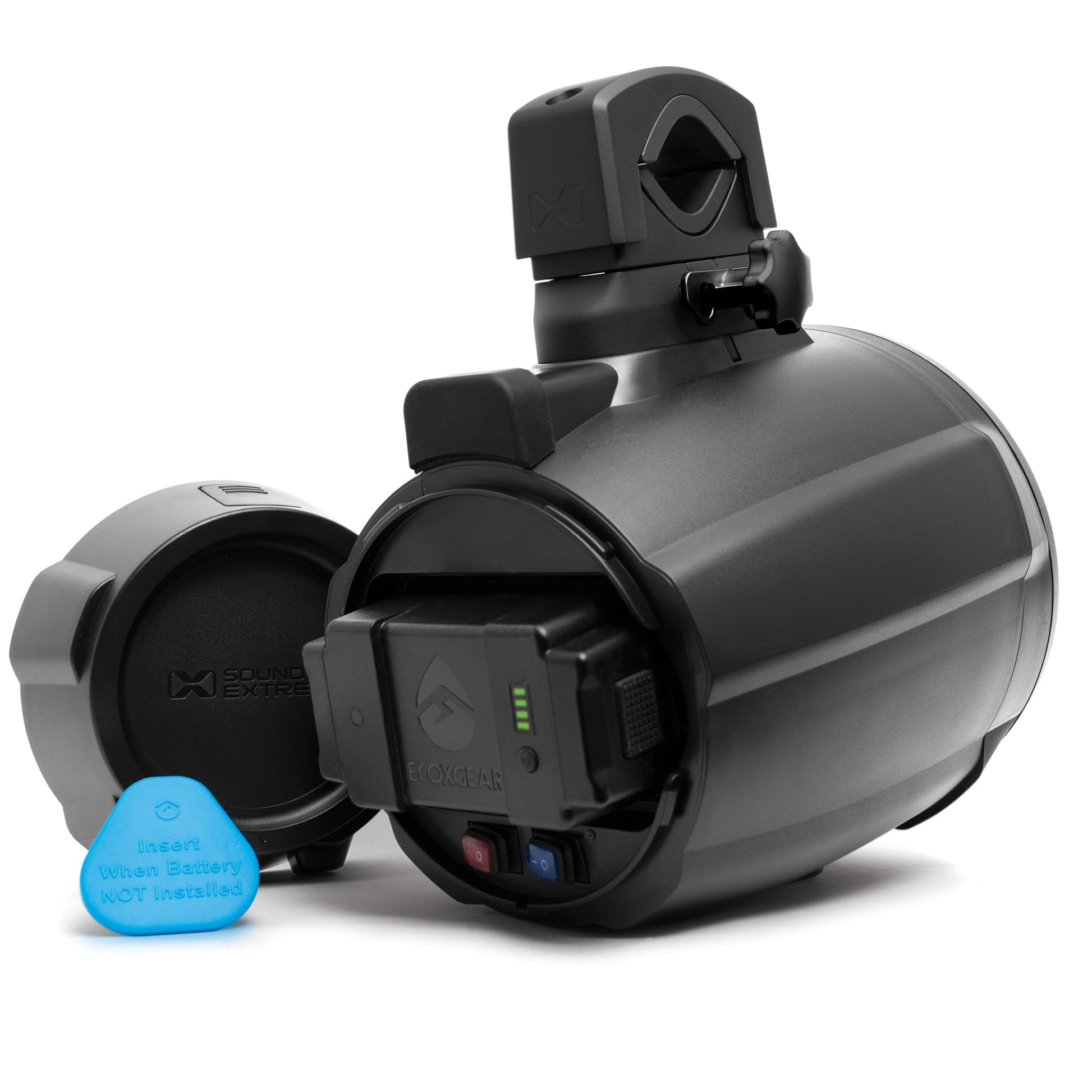 2-way 8" marine wakeboard ExtremeTower Speakers 1.5" titanium tweeter with double Neodymium magnet design Powered by included removable and rechargeable battery pack with optional power connection to vehicle or boat's 12V power supply Customize the audio output for mono or left and right stereo sound Built-in addressable RGB LED Lights and LED lighting controller with LEDCast technology 3 LED lighting control methods - (1) speaker buttons; (2) included RF remote control or (3) by SoundExtreme Android or iOS app LED white dome light Bluetooth 5.0 for long range reliable wireless connection to your smartphone EcoCast: wirelessly pair to ECOXGEAR SoundExtreme soundbars, subwoofers, and speakers (100 max) Bulit-in FM Tuner with integrated internal antenna and connector jack for optional external FM antenna (sold separately) UV protected polypropylene carbon fiber blend woofer with Santoprene rubber surround 100% water and sand proof Aviator and Deutsch™ connectors for audio & LED lights Acrylic Styrene Acrylonitrile (ASA) enclosures for UV resistance & IP66 waterproof rating 360° rotating speaker mount (Allen wrench and quick release knob included) Salt corrosion resistant 316 stainless screws & aluminum alloy mounts Clamp fits bar sizes from 1.5" to 3" diameter Required: passive speaker must be wired to the powered speaker to operate. Both through tower and outside bar cables provided Dual Cabling Options: through inside tower member or outside roll cage