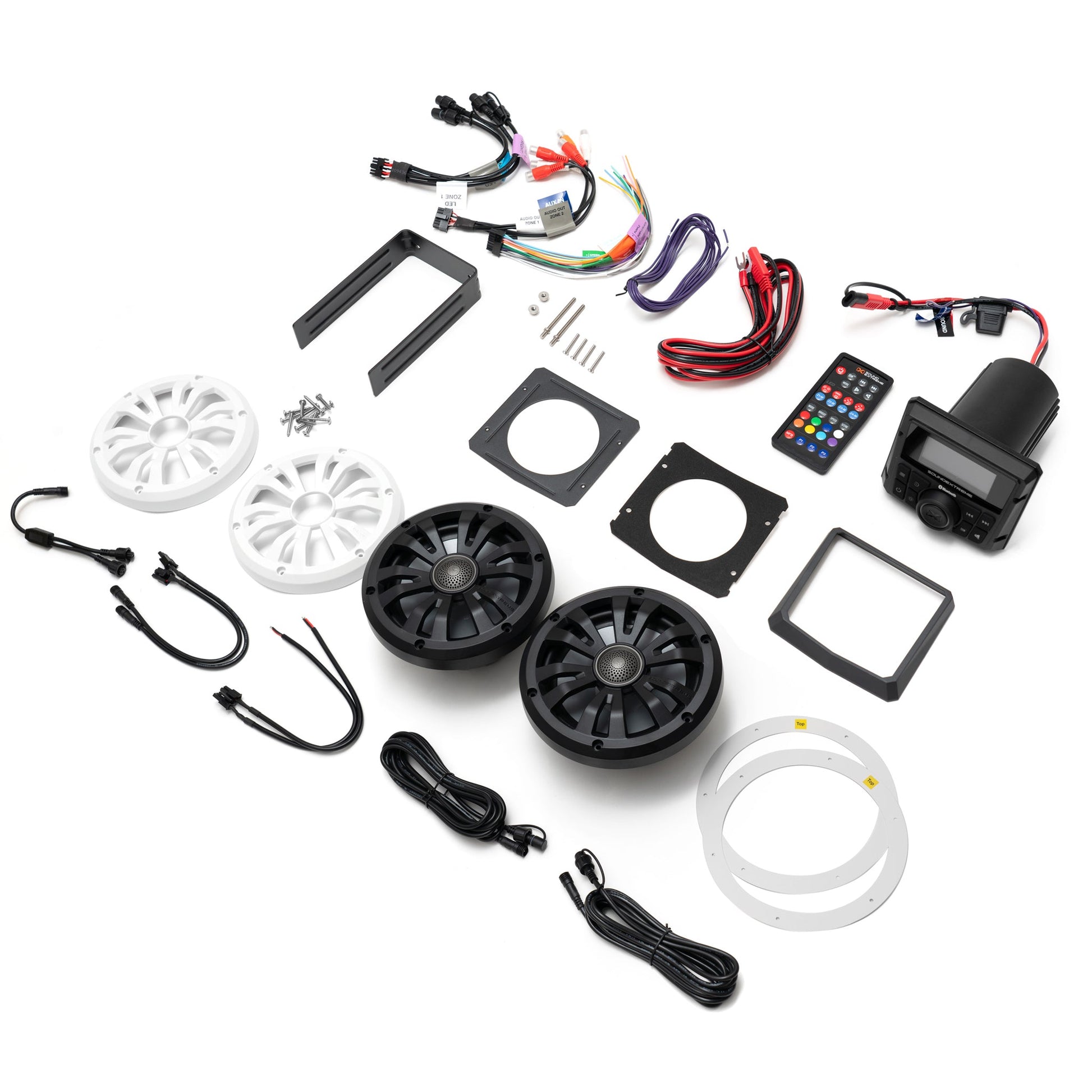 200 WATTS PEAK OUTPUT – (25 watts x 4 channels RMS) with a built-in 3-band equalizer and optional volume limiter controls to be as loud as you like to cut through all the wind and roar; Customize your audio listening experience with 1 or 2 wired audio zones and 1 wireless audio zone; Change zone volume independently or together, even change the zone names; 400 WATTS SPEAKER PEAK OUTPUT - (65 watts RMS) power the 6.5-inch low and mid-range woofers and 1.5-inch tweeters