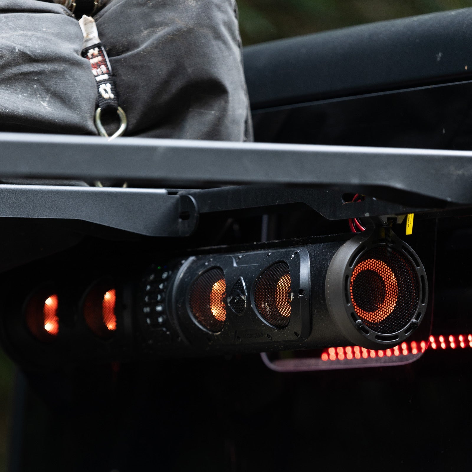 - Marine-grade speakers in IP66 Patent Pending enclosure providing 100% waterproof, dirt proof and dustproof audio