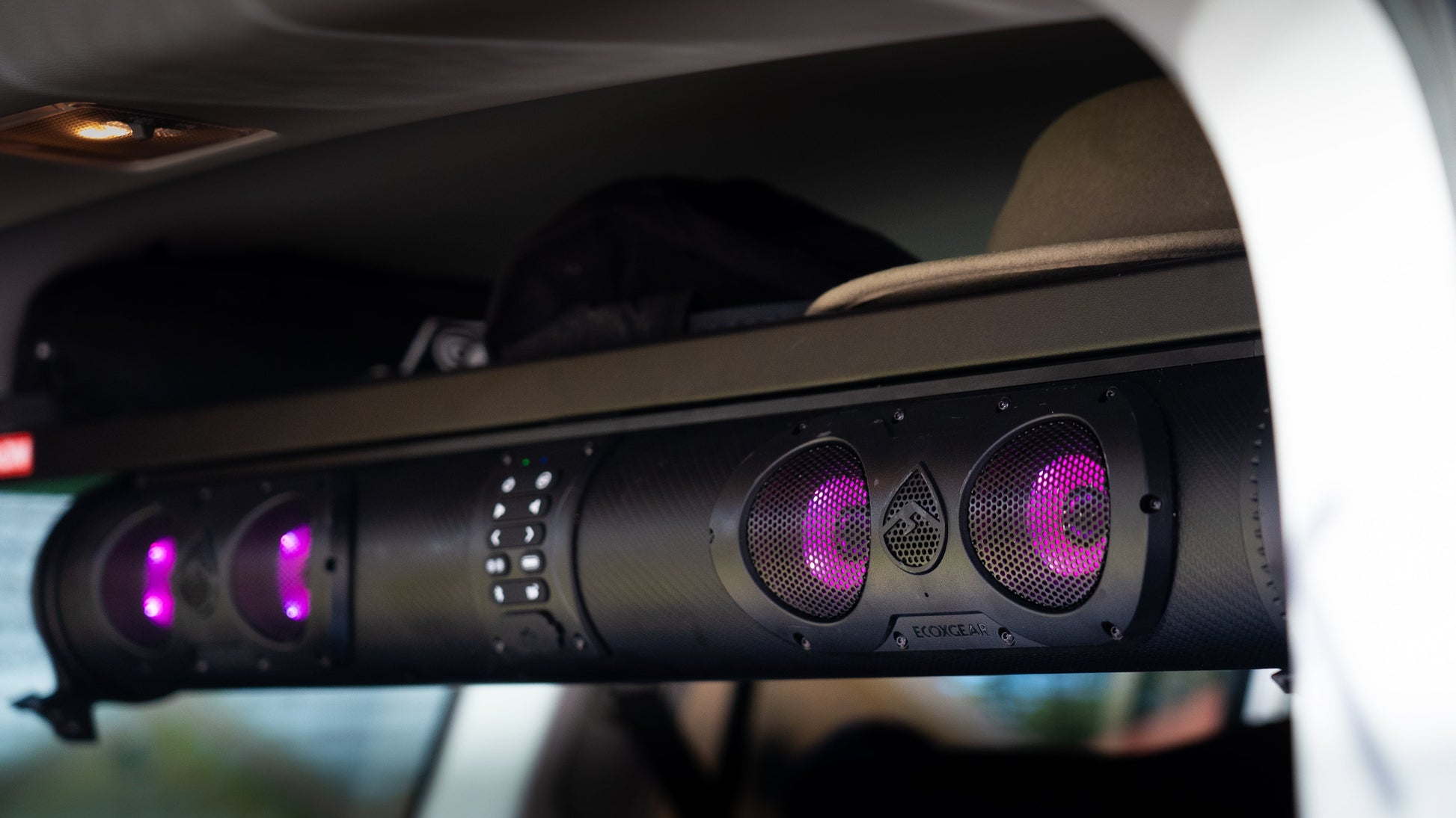 32" SoundExtreme powersports sound bar with 360 degree sound and LED lighting system Marine-grade speakers in IP66 Patent Pending enclosure providing 100% waterproof, dirt proof and dustproof audio 500 watts of peak power output 11 marine grade speakers: 3 tweeters, 6 mid-range and 2 side mounted woofers Two internal independently sealed cavities for true left and right stereo sound Bluetooth 5.0 for long range reliable wireless connection to smartphone EcoCast allows up to 50 soundbars to be connected together or connect to any ECOXGEAR speaker with the EcoCast feature. Integrated on speaker controls: Power, mode (Bluetooth/FM/Aux in), volume, skip FWD/Back, Ecocast, lights, Bluetooth Built in microphone for speakerphone calls. Multi-color LED’s backlight speakers: chose from red, green, white. Sync to music, solid color on or off. Rear Facing 280 Lumen LED light bar can be turned on separately from the speaker LED’s. LED light bar can be white, red or yellow Waterproof 12V auxiliary power out connection cables to link other 12 volt accessories Waterproof Aux In connection port to play audio from a wired device Waterproof Aux out jack to daisy chain to other optional wired speakers Waterproof 5V USB charge out to give a boost to your phone or other devices Mounting brackets and integrated threaded mounting holes for multiple mounting configuration options What’s in the box: SoundExtreme powersports soundbar, RF remote control, Mounting brackets, adjustable straps